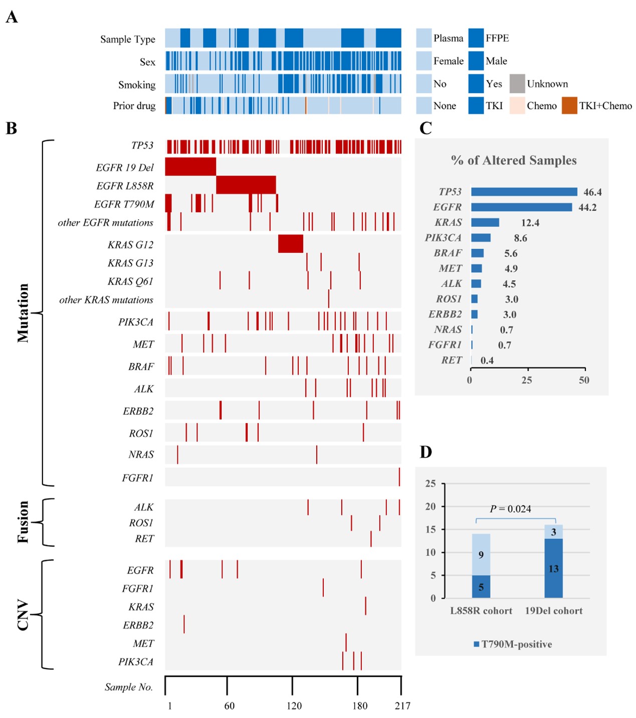 本研究纳入258例肺癌患者,中位发病年龄为59岁。利用NGS技术对入组样本进行了基因组图谱分析。数据分析结果发现217例样本检测到至少1个基因发生了突变。最常见的突变基因是TP53(46.4%),EGFR(44.2%)和KRAS(12.4%),其它基因发生突变的患者不超过10%(图1)。