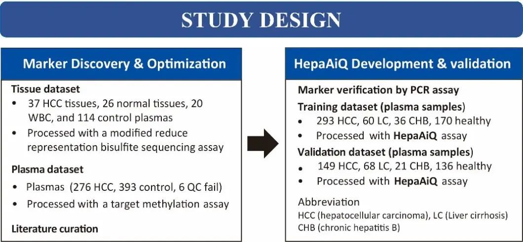 研究甄选出最优的甲基化标志物若干,再通过大量临床血浆样本构建HCC多基因甲基化血液检测模型-HepeAiQ™,并对HepeAiQ™模型进行盲法验证,测试模型的普适性和稳定程度。