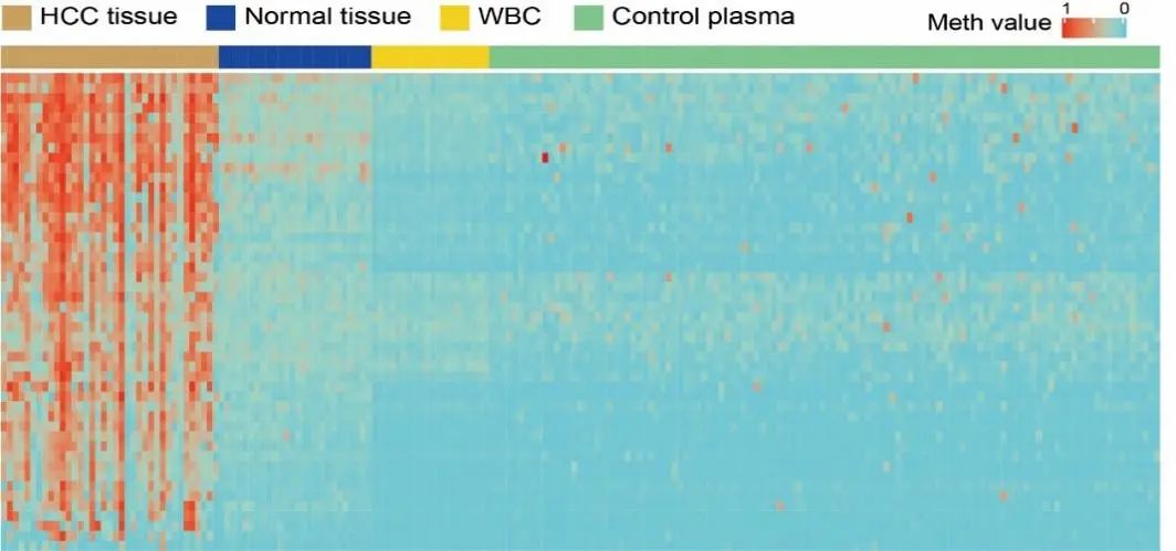 本研究利用MONOD®对37个HCC组织、26个正常组织、20个白细胞和114个空白对照(血浆)进行RRBS,遴选出数百个HCC特异性相关的甲基化标志物(图2),并以5个有代表性的标志物为例评估其对HCC的检测性能,发现其在HCC甲基化程度显著高于其他样本(图3)。