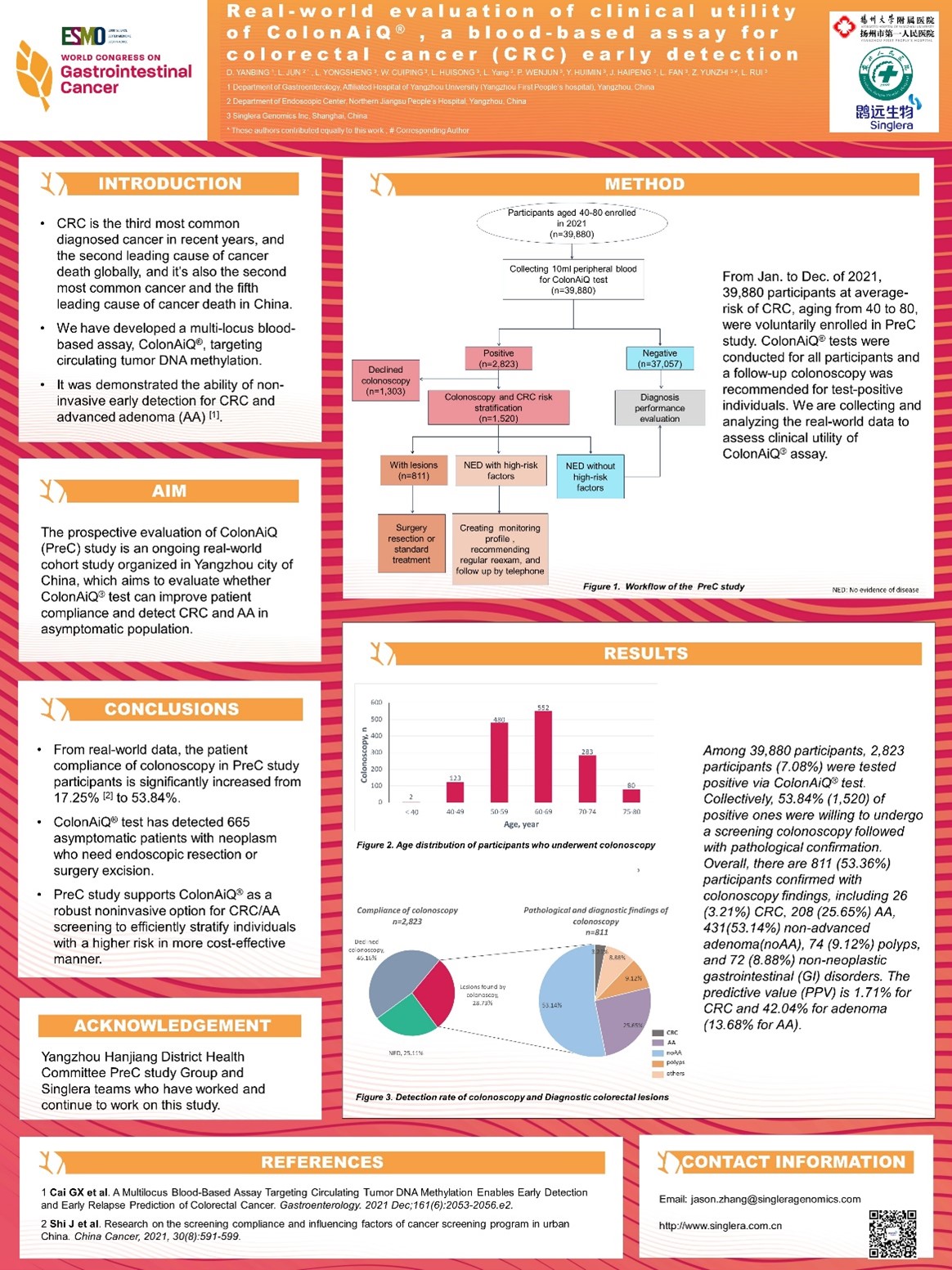 在先前的AACR年会上我们公布了2021年1-8月份的筛查数据(2022AACR年会英国365集团官网研究Poster报道之一:常艾克®( ColonAiQ)在平均风险人群中检测性能真实世界数据结果分析),随着项目的顺利推进,研究纳入了更多的适宜人群。在正进行的ESMO-WGI 2022大会上,我们发布了2021全年的筛查数据,总人群已从21,735例增加到39,880例。结直肠镜依从率为53.84%。在接受肠镜检查的1520例常艾克高危人群中,有超过一半发现了肠道病变(811例,占53.36%)。其中结直肠癌26例(3.21%),进展期腺瘤208例(25.65%),腺瘤639例(78.79%)、息肉74例(9.12%)和72例非肿瘤性肠道疾病(8.88%)。总体而言,常艾克检测结直肠癌的阳性预测值(PPV)达到1.71%,检测腺瘤的PPV达到42.04%。
