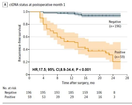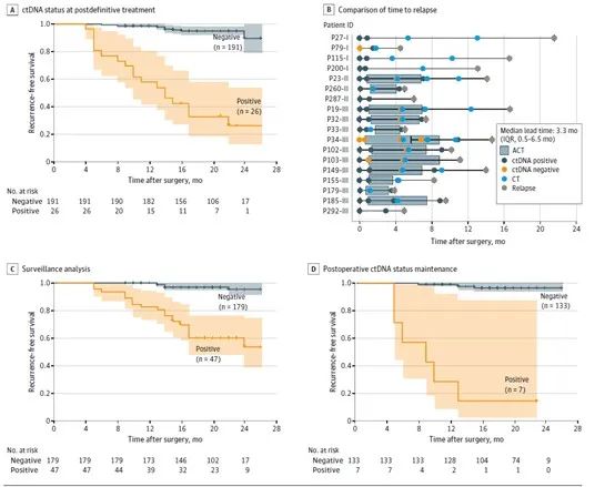 进一步的动态ctDNA检测结果显示,在确定性治疗后的疾病复发监测阶段(根治术+辅助治疗后),动态ctDNA检测阳性患者的复发风险显著高于ctDNA阴性患者(图3ACD),并且ctDNA可比影像学检查最多提前20个月提示肿瘤复发(图3B),为疾病复发的早期发现和及时干预提供了可能。