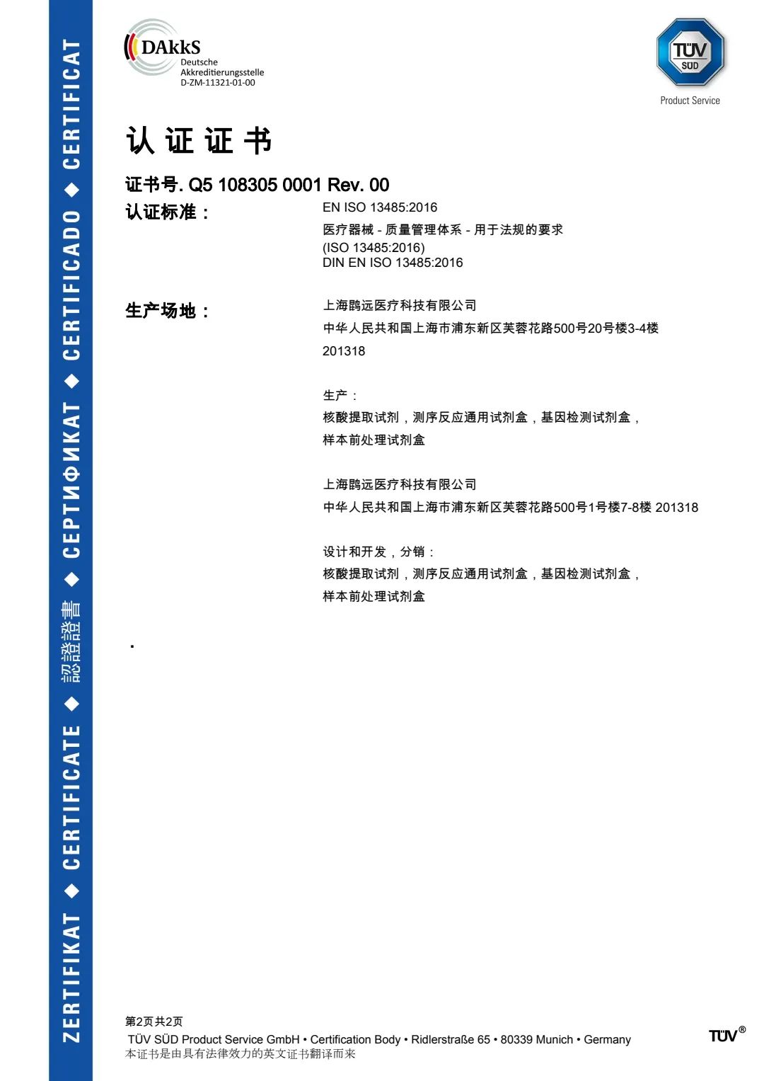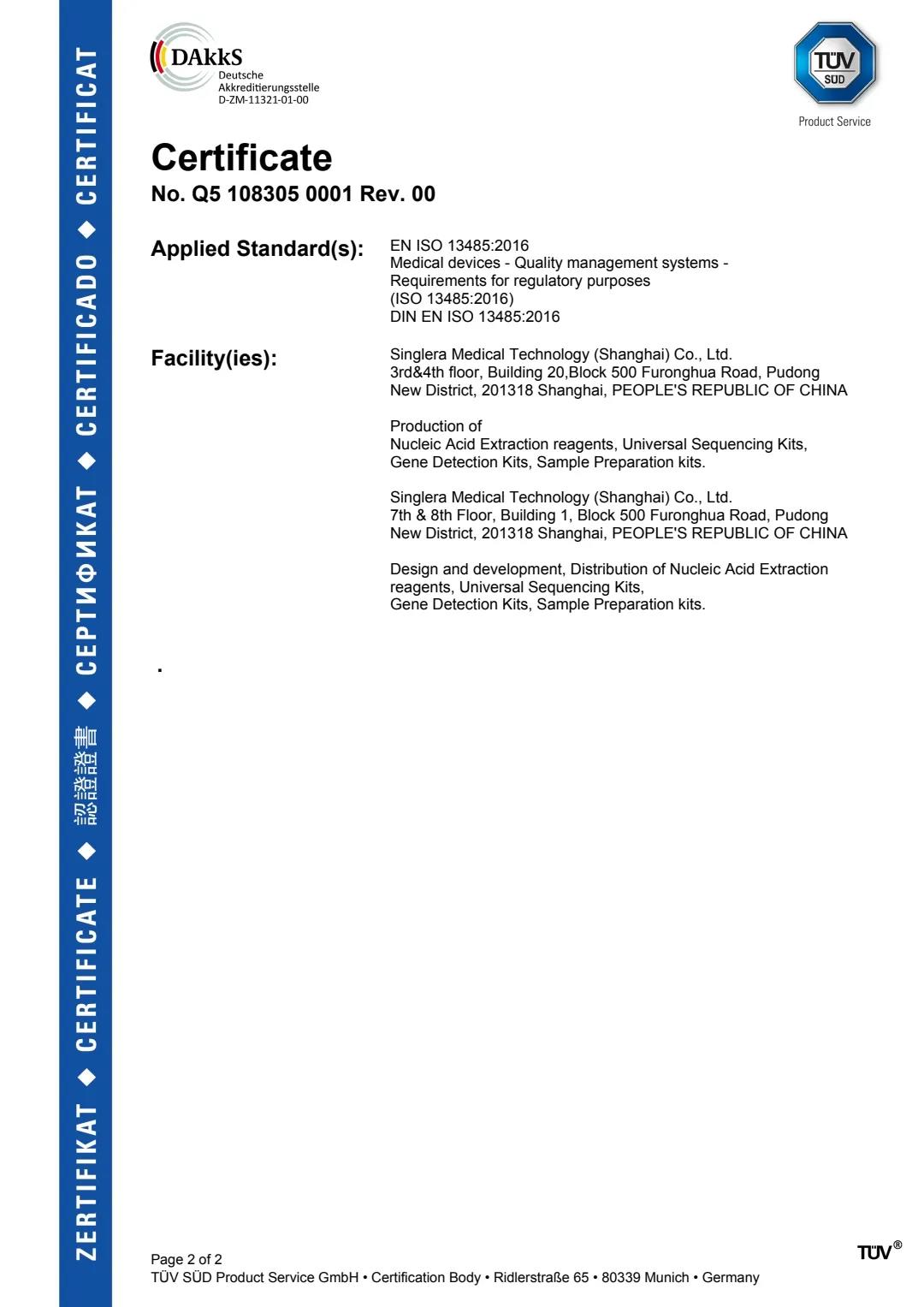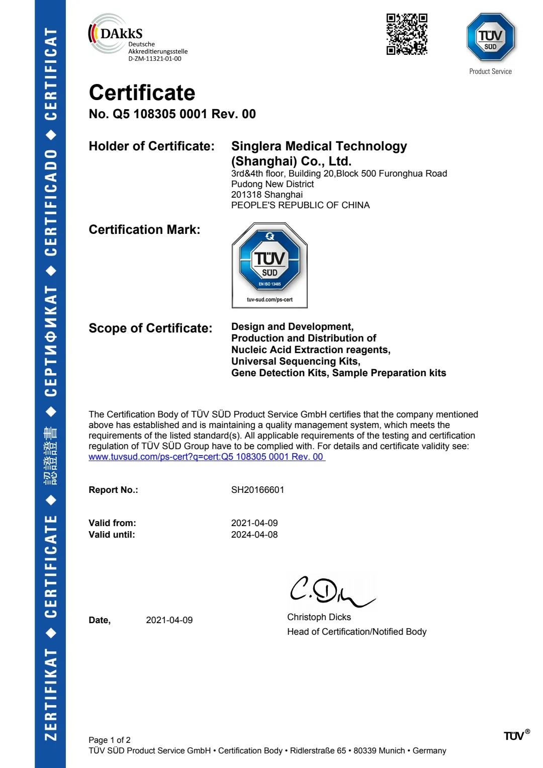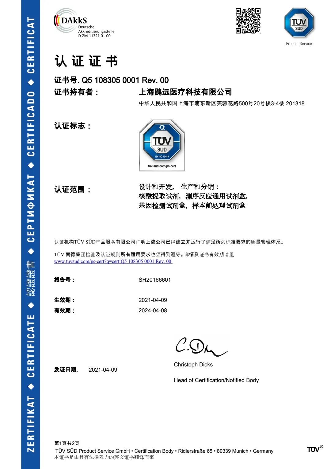 2021年4月14日,捷报频传,继英国365集团官网医学检验所顺利通过CAP认可评审后,英国365集团官网医疗又收到 德国莱茵(TÜV Rheinland)颁发的ISO 13485:2016质量管理体系认证证书,(证书编码: Q5 108305 0001 Rev.00),证书有效期为三年,生效期为2021年4月9日,有效期至2024年4月8日。