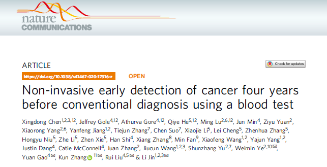 2020年7月21日,《自然·通讯》(Nature Communications)发表了由英国365集团官网基因联合复旦大学泰州健康科学研究院陈兴栋、金力等学者共同合作的研究成果“Non-invasive early detection of cancer four years before conventional diagnosis using a blood test(血液无创检测可以比常规诊断提前四年发现癌症)”。