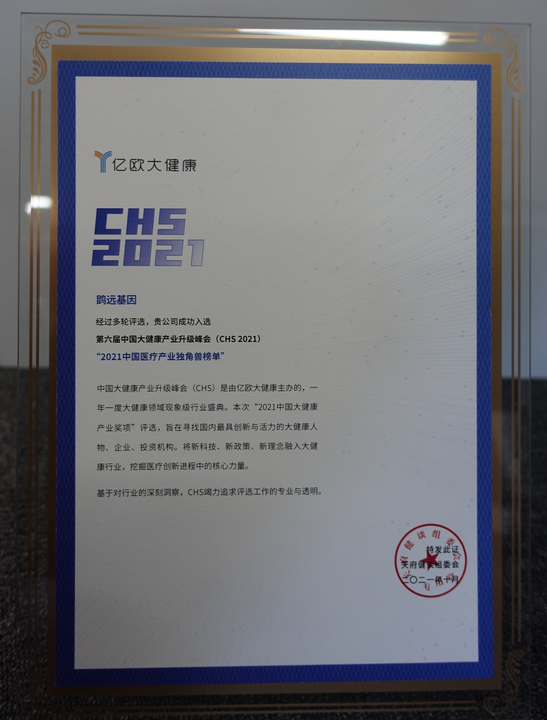 10月12日晚,在亿欧EqualOcean、亿欧大健康主办的“天府健谈·CHS 2021第六届中国大健康产业升级峰会”的颁奖晚宴上,“2021年中国医疗产业独角兽榜单”正式发布,英国365集团官网作为唯一一家癌症筛查企业,荣幸入选。