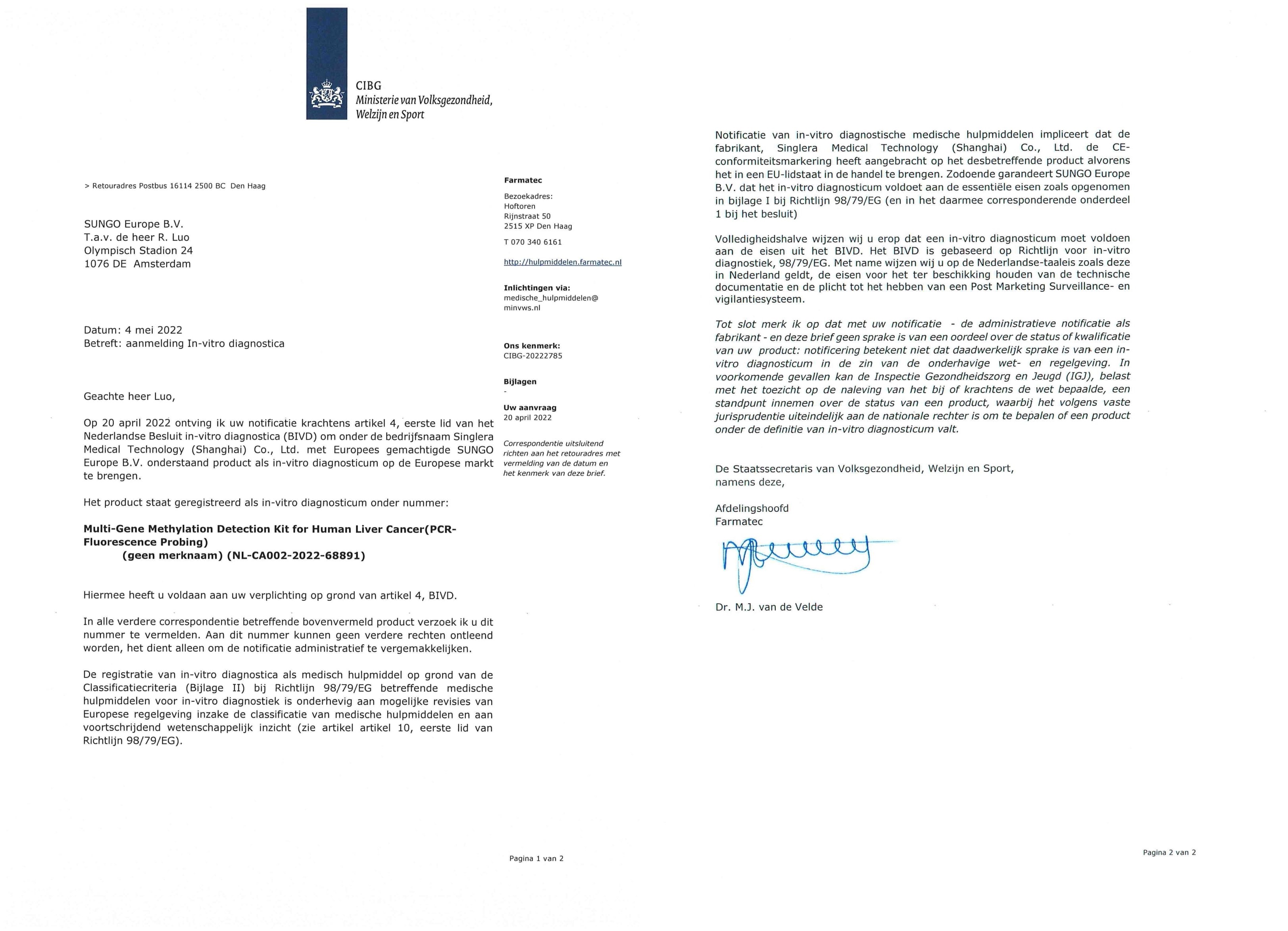 近日,英国365集团官网宣布其自主研发的人类肝癌多基因甲基化检测试剂盒(PCR-荧光探针法)获得欧盟 CE 资质(注册号:NL-CA002-2022-68891),标志着该产品可在欧盟国家以及认可欧盟CE认证的国家进行销售。