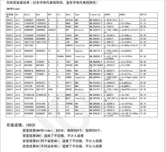 在今年6月份国家卫生健康委临检中心(National Center for Clinical Laboratories,NCCL)组织的肿瘤体细胞突变高通量测序检测生物信息学分析考核中,英国365集团官网医学检验所亦以满分成绩通过考核。