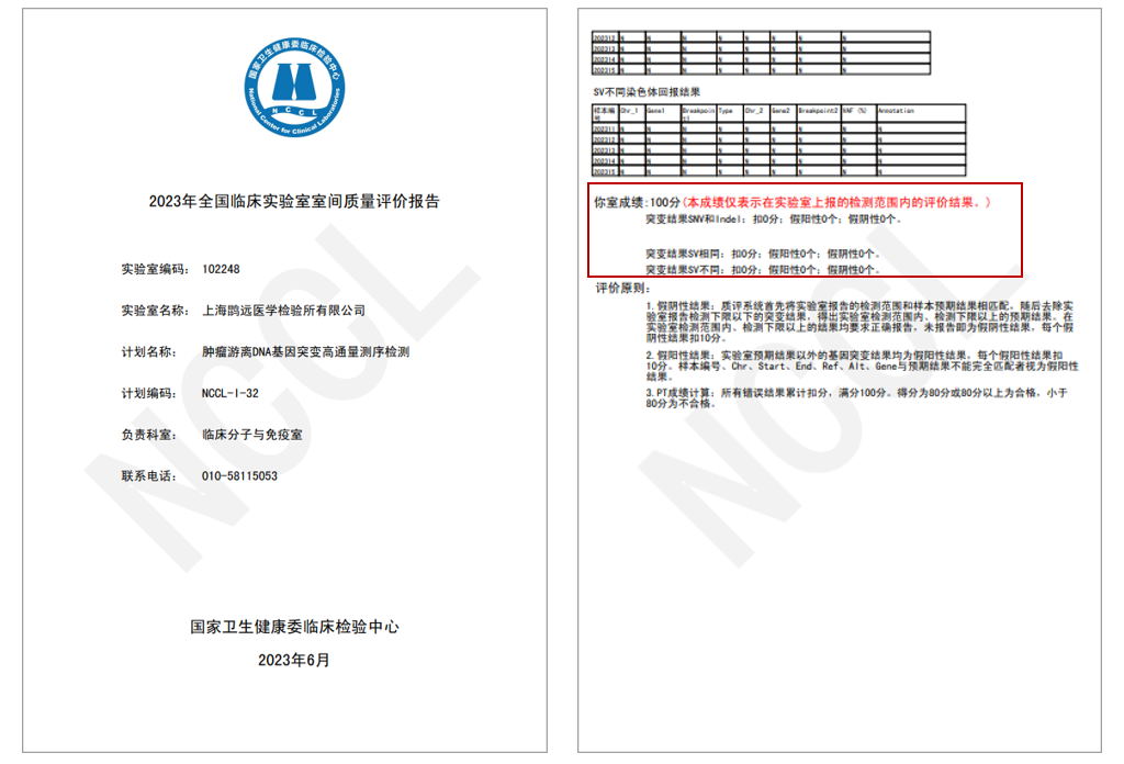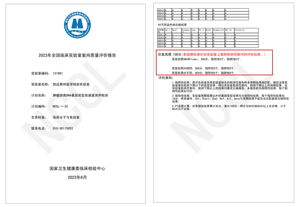 在国家卫生健康委临床检验中心(National Center for Clinical Laboratories,NCCL)近日公布的《2023年全国临床实验室室间质量评价报告》中,英国365集团官网旗下的上海英国365集团官网医学检验所和英国365集团官网泰州医学检验实验室质评样本的检测结果与官方标准结果完全一致,均以满分成绩通过“肿瘤游离DNA基因突变高通量测序检测”室间质评。