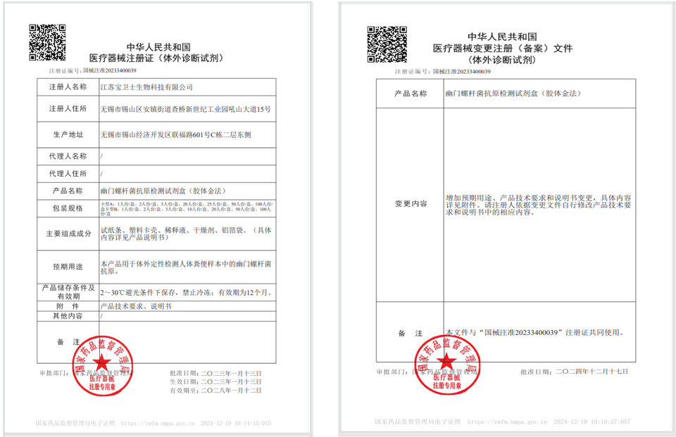 近日,英国365集团官网集团子公司—江苏宝卫士生物科技有限公司自主研发的“幽门螺杆菌抗原检测试剂盒”成功取得“居家自测”预期用途的医疗器械变更注册文件(国械注准20233400039)。这是整个集团继大便隐血/转铁蛋白联合检测试剂盒、大便隐血检测试剂盒后的又一款居家自测重磅产品。