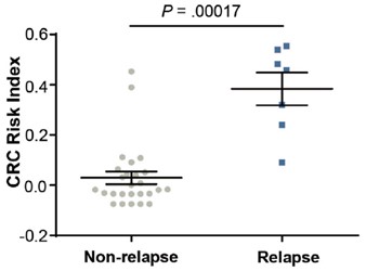 图1. The ColonAiQ score is significantly higher after surgery in patients with early relapse than in those without relapse.